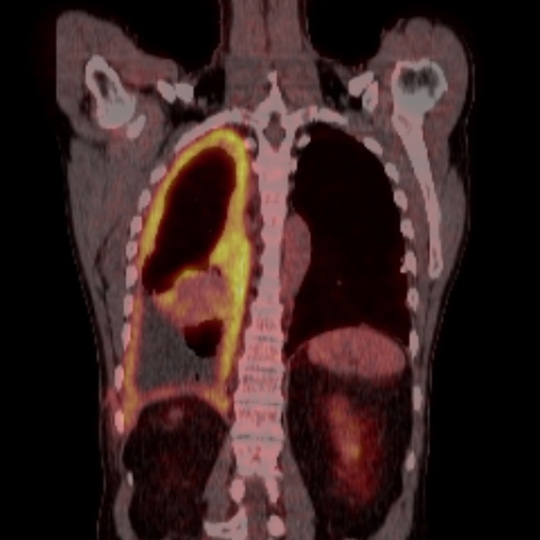 18F-FDG tas opp i celler med høyt energibehov, som hjerte- og hjerneceller, betennelsesceller og maligne celler. Avbildning med PET/CT viser til venstre opptak i et malignt pleuralt mesoteliom med typisk utbredelse langs mesotelkledde hinner, her langs høyre pleura, inkludert lappespaltene. Til høyre viser CT alene de strukturelle forandringene i detalj, men skiller dårligere mellom viabelt tumorvev og benigne forandringer, som atelektase.
