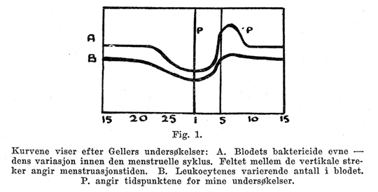 Så vist mig bekjent er dette forhold ennu et terra incognita med vide felter for gjetning. Gellers før omtalte undersøkelser kan kanskje peke i en bestemt retning. Han undersøkte blodets baktericide evne og dens variasjoner i og utenfor menstruasjonsfasen. Resultatet var en kurve som begynner å synke i præmenstruum, for å nå sitt laveste punkt 1ste og 2nen menstruasjonsdag. Derpå stiger den raskt og når sitt maksimum 7 dager efter 1ste menstruasjonsdag. Derpå synker den i løpet av 3 – 4 dager ned til det jevne intermenstruelle nivå. Imidlertid er jo blodets baktericide evne og den allergiske tilstand begge bare delfenomener av det vi med en felles betegnelse kan kalle organismens immunitetsforhold. Såvel Couland som Selters og mine undersøkelser kan tyde på at disse fenomener varierer parallelt. Konsekvensen herav skulde da være å anbefale v. Pirquets reaksjon hos voksne kvinner utført mellem 5te og ca. 20de dag regnet fra 1ste menstruasjonsdag. (Se kurven.)