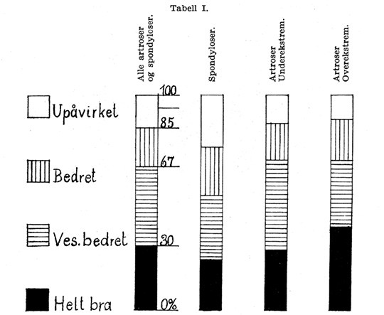 (…) Det er i hvert fall overveiende sannsynlig at røntgenbehandlingens angrepspunkt ikke må søkes i ben eller brusk, men i bløtdelene. Dette vil også best forklare at der er så liten relasjon mellem utviklingen av ben- og bruksforandringene, patientens besvær og behandlingsresultatet.