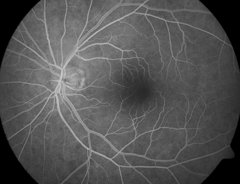 På mistanke om kjempecellearteritt ble behandling igangsatt med metylprednisolon intravenøst 250 mg × 4 i fire dager, deretter 60 mg prednisolon daglig og videre langsom nedtrapping. Tross behandling opplevde pasienten initialt stadige ortostatisk utløste kortvarige synstap. Etter to døgn ble acetylsalisylsyre lagt til behandlingen. Det tredje døgnet mistet pasienten synet på venstre øye. Fluoresceinangiografi tatt under synstapet viste tilnærmet opphevet retinal sirkulasjon. Bildet til venstre viser en nær komplett avstenging av arteria centralis retinae – lyse, fluorescerende kar er perfunderte, mens mørke ikke er perfunderte. Etter omtrent seks timer kom synet tilbake.