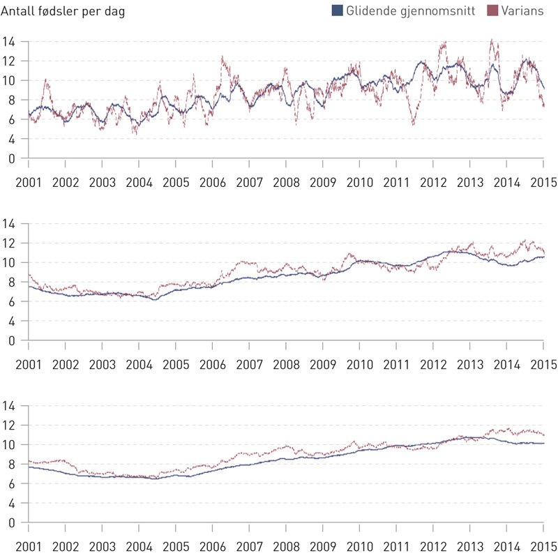 Alle statistiske analyser er utført i statistikkverktøyet R (16, 17). Vi plottet et glidende gjennomsnitt (over henholdsvis 90, 360 og 720 forutgående dager) for antall ikke-elektive fødsler, mot samme periodes varians, for perioden 1.1. 2001 – 31.12. 2014.