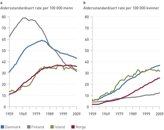 Rettelse Lungekreft – insidens etter kjønn, alder og bostedsfylke 1984 – 2013 Tom Kristian Grimsrud, Hans Kristian Skaug,, Inger Kristin Larsen Om forfatterne Se alle artikler Tom Kristian Grimsrud Se alle artikler Hans Kristian Skaug, Se alle artikler Inger Kristin Larsen () sporsmal_grey_rgb Artikkel Figur 1 Lungekreft i Finland, Danmark, Island og Norge. Insidensrater for a) menn og b) kvinner, aldersstandardisert i henhold til verdens standardbefolkning, glattet med femårige glidende gjennomsnitt. Data fra Sverige er utelatt fordi registreringen er forskjellig og ratene derfor ikke er sammenliknbare. Data fra NORDCAN (3) Tidsskr Nor Legeforen 2015; 135: 1844 – 9 I Tidsskriftet nr. 20/2015 s. 1845 var det skjedd en fargeombytting i figur 1a. Dette er den korrekte figuren. Vi beklager feilen, den er rettet på nett. Kommentarer ( 0 ) Dette kommentarfeltet modereres, men kommentarer blir ikke redaksjonelt behandlet ut over å sikre at de følger retningslinjer for vårt kommentarfelt. Denne artikkelen ble publisert for mer enn 12 måneder siden, og vi har derfor stengt for nye kommentarer. Publisert: 15. desember 2015 Tidsskr Nor Legeforen 15. desember 2015 doi: 10.4045/tidsskr.15.1244 Opphavsrett: ©️️ Tidsskriftet 2025 PlumX 135 : 2131 Publisert: 15. desember 2015 Tidsskr Nor Legeforen 2015 135 : 2131 doi: 10.4045/tidsskr.15.1244 Opphavsrett: ©️️ Tidsskriftet 2025 Plum Print visual indicator of research metrics PlumX Metrics PDF Får du ikke vist PDF-filen eller vil lagre filen, kan du høyreklikke på PDF-ikonet. Velg «Lagre mål/fil som..» og hent så opp PDF-filen i for eksempel Acrobat Reader. Skriv ut Anbefalte artikler