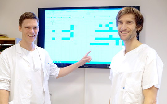 GOD OVERSIKT: – Tavlen hjelper oss til å huske alt vi skal gjøre, sier legene Martin Paulson og Gustav Siqueland. Foto: Sykehuset i Vestfold