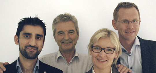 Fra venstre til høyre: Biveileder Sheraz Yaqub, hovedveileder Tom Øresland, forskningskoordinator Merete Helgeland og stipendiat Johannes Kurt Schultz. Foto: Michela Monteleone