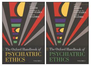 Oxford University Press satser stort på «handbooks», der lesere med forkjærlighet for akademisk lesning og tilhørende retorikk tilbys faglig oppdaterte ekspertfremstillinger av ulike saksområder. Nå foreligger det et tobindsverk om etikk i psykiatrien. Begrepet «håndbok» synes imidlertid ved første øyekast å være en sterk underdrivelse, størrelsen på verket tatt i betraktning (godt over 1 500 sider når «author» og «subject index» telles med). Tar man imidlertid oppbygningen av verket nærmere i øyesyn, kan sjangerbetegnelsen allikevel forsvares. Det består av ti hoveddeler med til sammen 94 kapitler. Begge bind er utstyrt med en kortfattet og instruktiv gjennomgang av hvert kapittel med tilhørende nøkkelord, det gjør det lettere for leseren å orientere seg i det tilsynelatende uoversiktlige terrenget.
