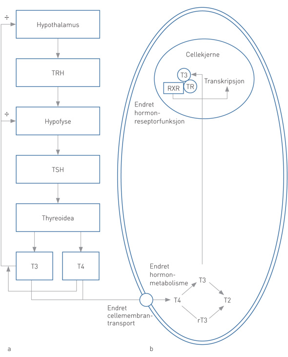 Tilstander med nedsatt følsomhet for thyreoideahormon kan inndeles i tre grupper ut fra endret funksjon av hormonreseptor, endret transport over cellemembranen, endret hormonmetabolisme (7) (tab 1).