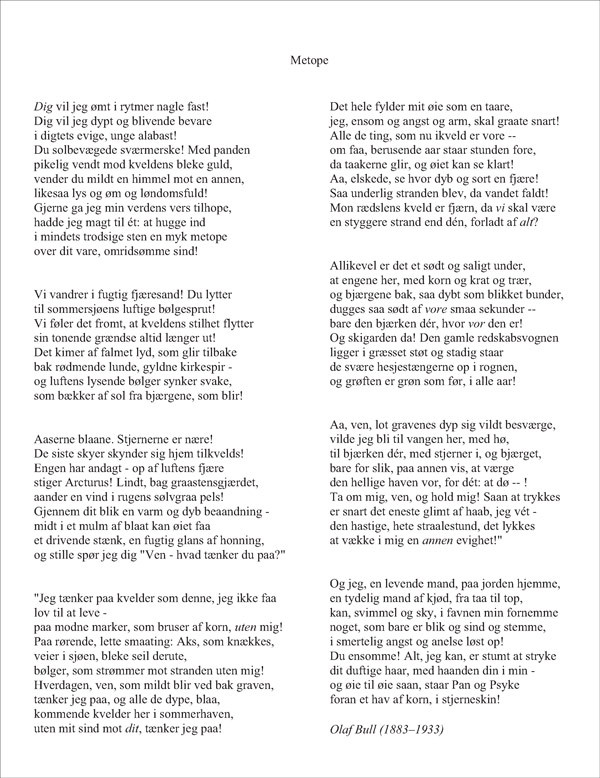 Diktet Metope kom i diktsamlingen med samme navn i 1927. Det er skrevet til hans tredje kone, Susanne Dain (f. 1895), som han giftet seg med i 1925 (2). Diktet er formet som en samtale mellom dikteren – mannen – og hans elskede, en kvinne. Det består av tre deler. De første tre strofene er mannens, i form av hans tanker og en kort replikk. Deretter svarer hun i de fire neste strofene, før hans tanker avslutter diktet i den aller siste strofen. Diktet har altså form av en dialog, og det er dette aspektet jeg skal se nærmere på i denne artikkelen.
