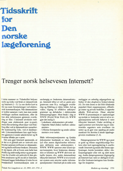 Hovedartikkelen, som bærer den noe restriktive tittelen «Trenger norsk helsevesen Internett», har mulig en vag konklusjon på sitt eget spørsmål, men artikkelen er – i ettertidens lys – humørvekkende lesning. Blant annet har vi mellomtittelen «Vil Internett fortsette å ekspandere?», hvor artikkelforfatter Bjarte G. Solheim, daværende leder for Legeforeningens informatikkutvalg skriver: