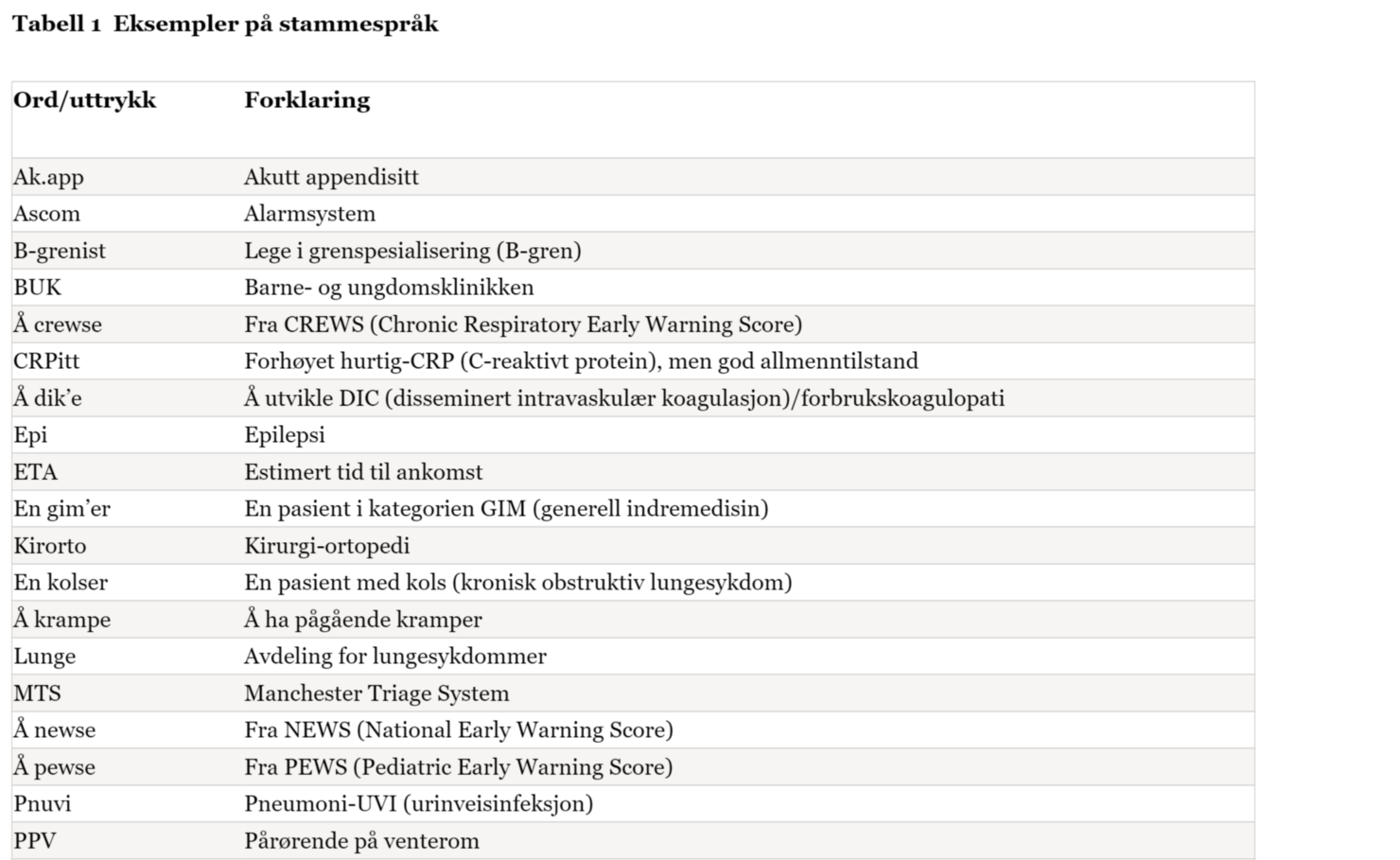 Fagspråk skal være presist og saklig og sikre effektiv kommunikasjon mellom fagfolk (1) . Stammespråk er en internsjargong som brukes av en avgrenset gruppe som driver med det samme. Det har spesielle begreper med betydninger som kun gruppen forstår – og kan være identitetsskapende (1) . Overnevnte eksempler med intern akuttmottakssjargong er en blanding av fagspråk og stammespråk. Mange av begrepene vil man for eksempel ikke kunne finne i medisinske ordbøker. I tabell 1 er det forklaringer.