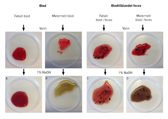 Prøven observeres så for fargeomslag. En løsning som ikke endrer farge, indikerer hemoglobin som er stabilt mot denaturering, og gir mistanke om føtalt blod (A, C). En løsning som raskt endrer farge til en gulbrun eller grønn farge indikerer hemoglobin som denatureres, og gir mistanke om maternelt blod (B, D). En kontrollprøve uten tilsatt lut kan benyttes for sammenligning, og fargeomslag bør forekomme innen to minutter. For korrekt tolkning bør prøven utføres innen 30 minutter (3) .