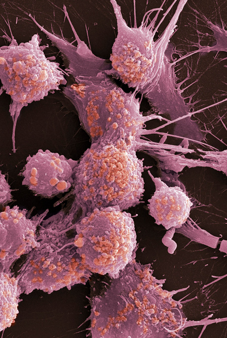 Kreftceller i prostata fremstilt ved hjelp av farget elektronmikrografisk skanning (SEM). Illustrasjon: Science Photo Library