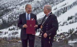 Harald Lystad får overrakt medaljen av ordføreren i Hemsedal kommune, Oddvar Grøthe. Foto Liv Torunn Torpe