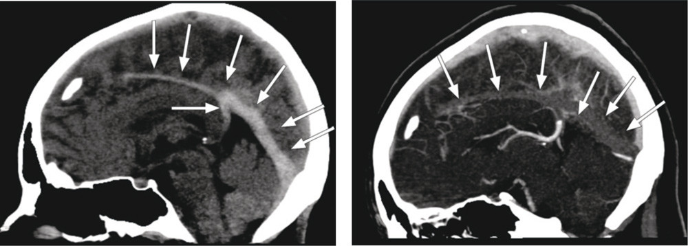 Kontrastforsterket CT-undersøkelse kan avdekke «empty delta (Δ) sign», der tromben ses som en lavtett triangulær forandring omgitt av den røntgentette hvite kontrasten. Hos vår pasient så man altså høy tetthet allerede på native serier. Dette fenomenet omtales i litteraturen som «cord sign» og skyldes trombose (2) . Et tilsvarende fenomen, kalt «hyperdense artery sign», kan ses ved akutt iskemisk hjerneslag.