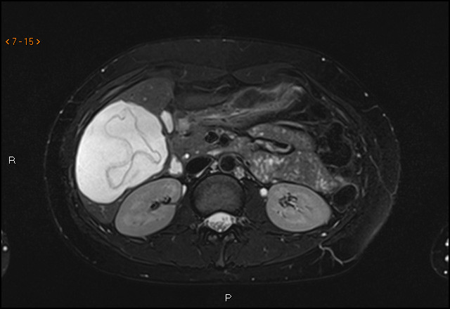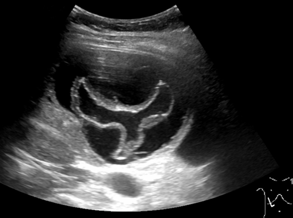Ultralydundersøkelsen viste en cyste i leveren. Største diameter var 10 cm. Den hadde en foldet indre struktur, forenlig med en separat, flytende indre membran, såkalt vannliljetegn. Dette funnet er karakteristisk for ekinokokkcyste. Pasienten ble henvist videre til infeksjonsmedisiner. Serologiske prøver var også positive for ekinokokker.