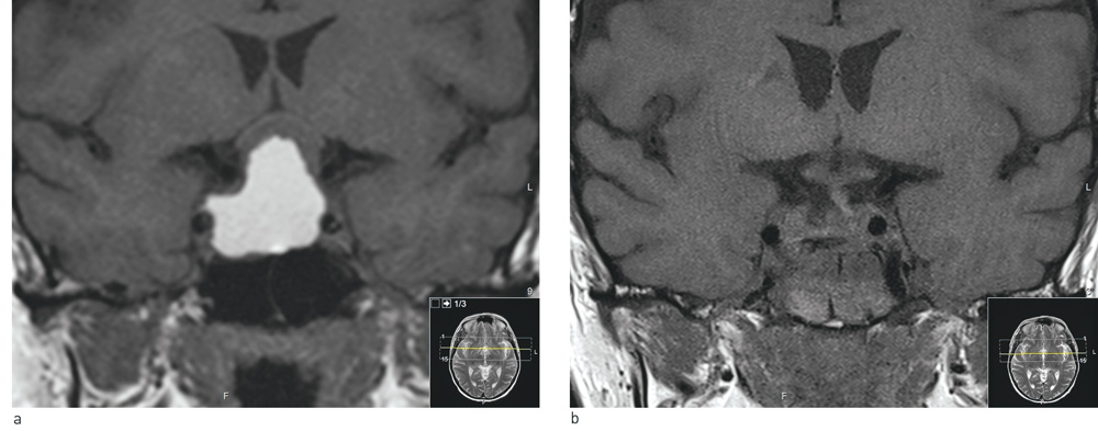 Siden sjansene for bedring av en hypofysesvikt bare er marginalt større enn risikoen for forverring av hypofysesvikten ved kirurgi, representerer hypofysesvikt alene ingen sterk indikasjon for kirurgi (15). Transsfenoidal kirurgi med mikroskop og/eller endoskop er foretrukne operasjonsmetode. Dersom pasienten ikke kan opereres, kan strålebehandling være et alternativ. Hovedmålet med behandlingen er å bevare synsfunksjonen. Kirurgi bedrer synsfunksjonen hos ca. 80 % av pasientene, ofte innen få dager etter inngrepet (12, 13). Vår pasient opplevde en subjektiv normalisering av synet og bortfall av hodepinen allerede samme dag hun ble operert.