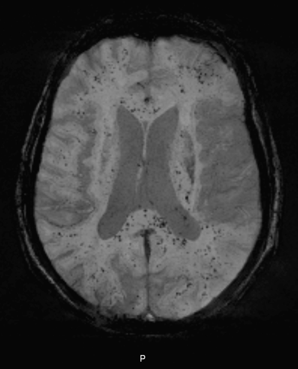 Blant de radiologiske differensialdiagnosene er diffus aksonal skade (diffuse axonal injury, DAI) og amyloid angiopati. Ved diffus aksonal skade ville man forvente mikrohemorrhagier hovedsakelig i grensesnitt mellom grå og hvit substans, men også i corpus callosum og pons. Pasienter med diffus aksonal skade har nevrologiske symptomer umiddelbart etter traume. Vår pasient hadde upåfallende MR-undersøkelse med SWI-sekvens fra 2010, noe som talte imot amyloid angiopati.