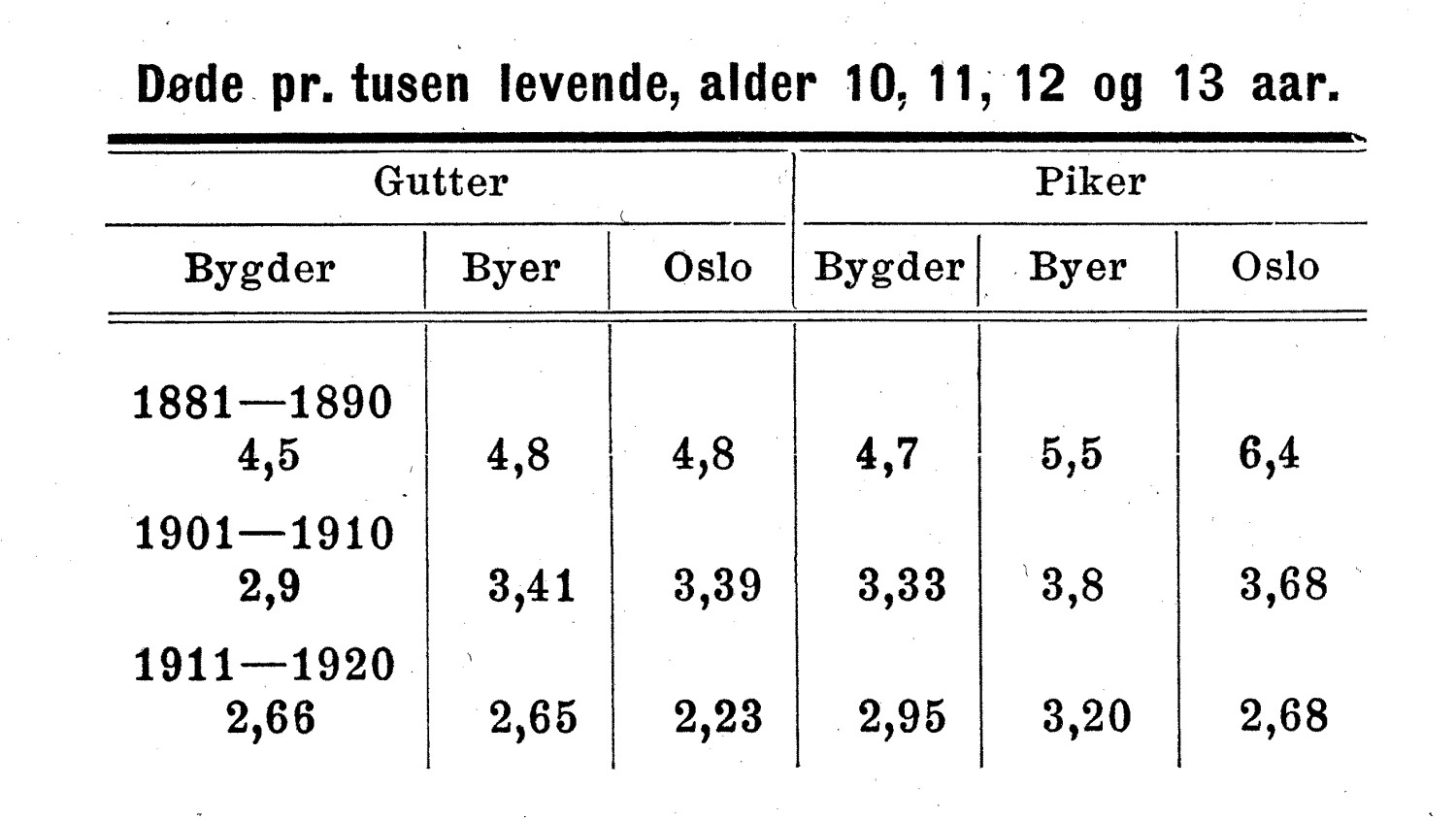 Vi ser, at der har været overordentlig stor fremgang fra ti-aaret 1881 – 90. Der dør næsten kun halvparten i siste ti-aar mot for 30 aar siden. Vi maa dessuten erindre, at det siste ti-aar omfatter den ondartede influenza-epidemi i 1918, saa det er merkelig, at dødeligheten til trods herfor er saa ringe. Specielt staar Oslo udmerket. Dødeligheten i siste ti-aar for 12 aars alder er endog nede i 2,08 for gutter. Jeg er ikke i tvil om, at sporten spiller her en stor rolle. Den styrker og hærder.