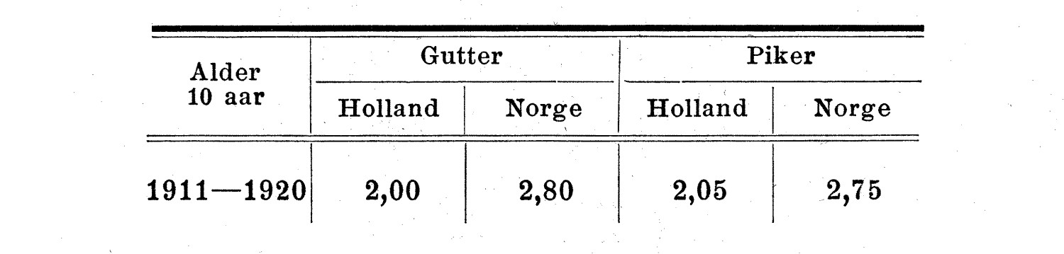 Vi vil nu se nærmere paa statistik for 10 aaret 1911 – 20 sammenlignet med ældre perioder. For at gjøre forholdende saa enkle som mulig har jeg slaat sammen de fire aldersklasser 10, 11, 12 og 13 aar – svarende til folkeskolens øverste fire klasser.