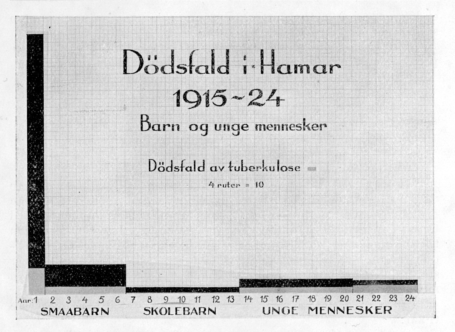 Jeg vil til slutning vise en grafisk fremstilling av dødsfald blandt barn og ungdom i Hamar det siste ti-aar. Det er ikke for at komme med tal, men kun for at vise, hvor merkelig gunstig de syv skoleaar staar i forhold til baade smaabarn-alderen og unge mennesker. Gjennemsnitsdødeligheten er 2,5 ‰ for skolebarn paa Hamar, altsaa nogen brøkdeler bedre end gjennemsnittet for det hele land. Hvis den samme lov skulde gjøre sig gjældende for skolebarn som for smaabarn og unge mennesker, vilde vi ha en dødelighet hos skolebarn paa mindst 6 ‰. Vi ser paa den grafiske kurve spedbarnsaaret som den høie isolerte søile. Saa har vi de fem smaabarnsaar med en forholdsvis stor dødelighet. Saa kommer de 7 skoleaar – menneskelivets lykkeligste tid, hvor døden er en sjelden gjest. Dødeligheten er kun en brøkdel av hvad den var i smaabarn-aarene. Saa har vi ungdoms-aarene til sist med større dødelighet. Min kurve er kun ført til 24 aars alder. At skolebarn-alderen har sin egen lov at gaa efter, ser jeg bl. andet av dødsfald ved epidemiske sygdommer. Mens smaabarnsalderen opviser her paa Hamar i ti-aaret hele 16 dødsfald av epidemiske sygdommer, har skolebarnsalderen intet. Jeg mener ikke, at skolebarnsalderen er forskaanet for dødsfald av epidemiske sygdommer. Mine tal gjælder kun et kort tidsrum i smaa forhold; men det er ganske merkværdig, at skolebarn greier den samme epidemi uten dødsfald, mens smaabarnsalderen har saa mange.