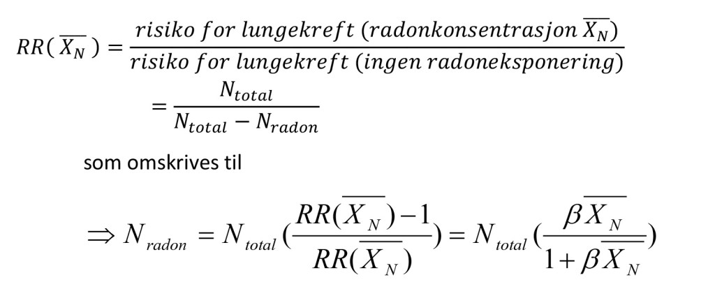 Nradon brukes i det følgende som symbol for den lungekreftinsidensen (antall nye lungekrefttilfeller per år i Norge) som har radon som medvirkende årsak, gitt at populasjonen lever ved en gjennomsnittlig radonkonsentrasjon i boligen. Ntotal defineres som total lungekreftinsidens i samme periode. Den radoninduserte relative risikoen i befolkningen kan da uttrykkes som