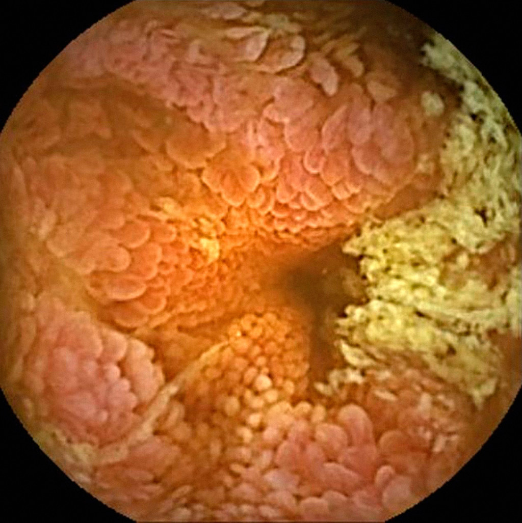 Kapselendoskopi av tynntarmen til en pasient med Crohns sykdom viser inflammatoriske polypper (røde hevelser) og sårdannelse (hvit). Foto: Science Photo Library