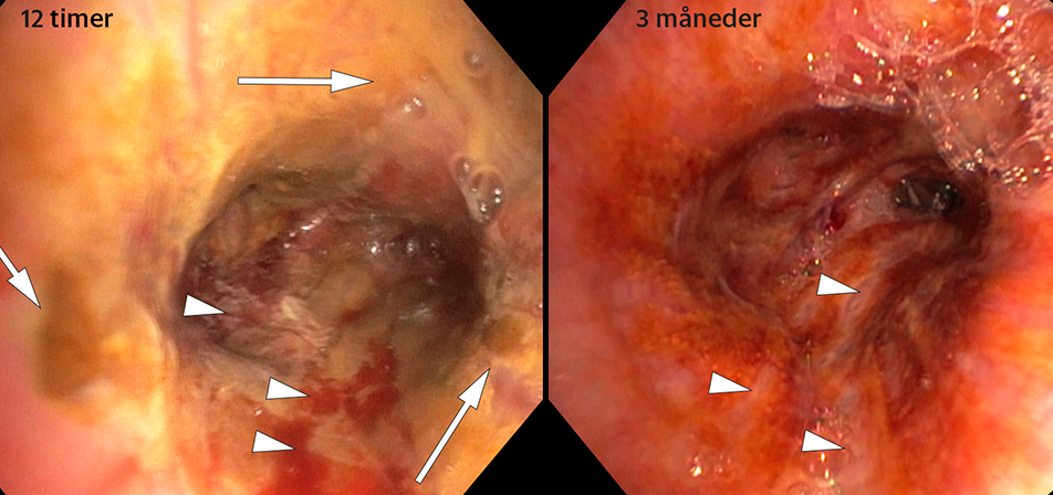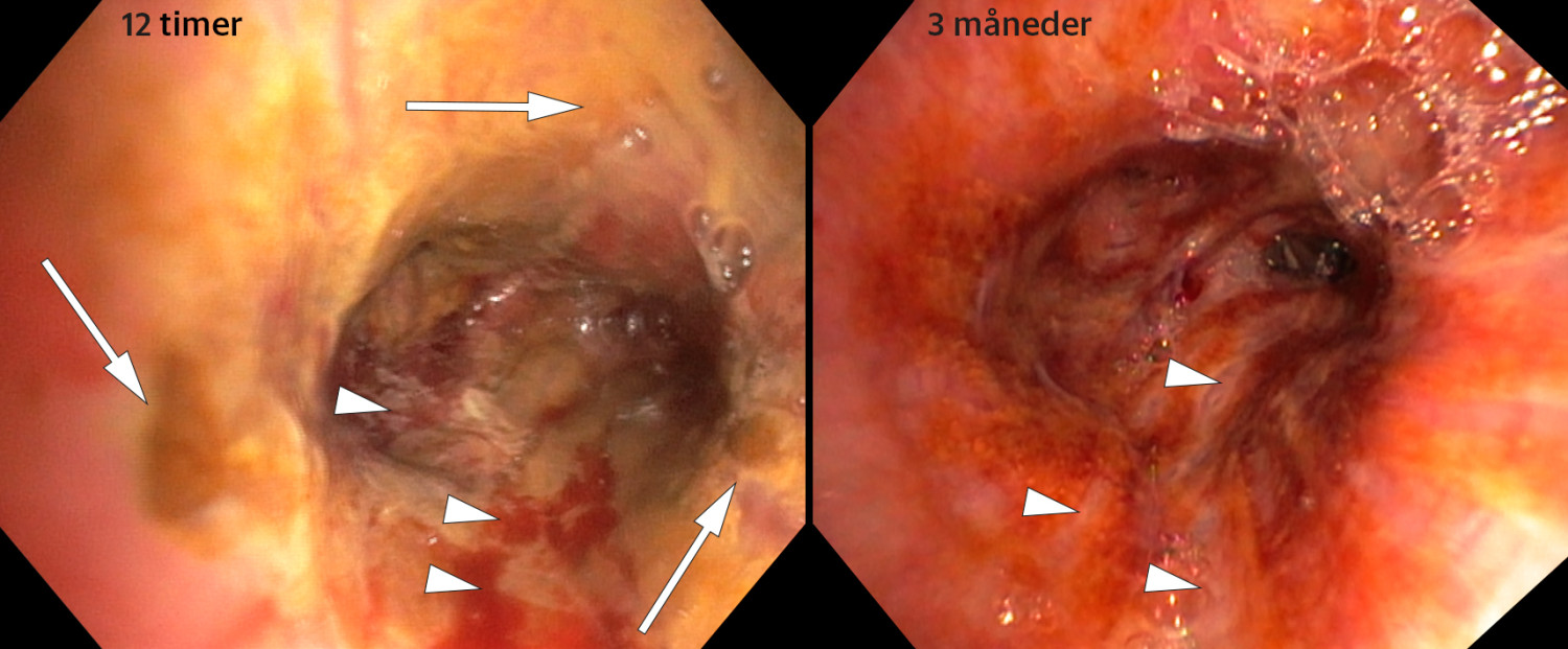 Bronkoskopi ble utført 12 timer etter uhellet (video). Det ble observert et brunlig ekspektorat på stemmebåndene. Fra carina, nedover høyre hovedbronkie og ved ostiet mot overlappen var det brunlig ekspektorat og belegg. Bronkialslimhinnen fremsto som inflammert. I bronchus intermedius var det uttalte forandringer (første bilde) med brunlig belegg (piler) og sårdanninger (pilhoder). Tablettene var gått i oppløsning, og det brunlige belegget lot seg ikke fjerne ved skylling. For å dempe inflammasjonen ble han satt på prednisolon frem til første kontroll tre uker senere. Ved kontroll etter tre måneder var han symptomfri, men det var fortsatt betydelige slimhinneforandringer (det andre bildet) med danning av arrvev (pilhoder).