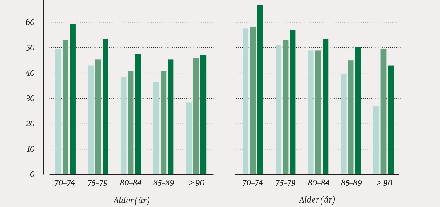 Også hos dem over 90 år ventes det utvikling av en større hjelptrengende befolkningsgruppe (17) i Spania, mens i en dansk studie ble det ikke vist at de aller eldste fikk større behov for hjelp i siste del av livet (18). I denne studien ble alle som var født i Danmark i 1905 og bodde i landet i 1998 inkludert, til sammen 2 262 personer. Denne gruppen er sammenlignet med kohorten som var født ti år tidligere. Resultatene viste at 1905-årgangen var sterkere og friskere (19).