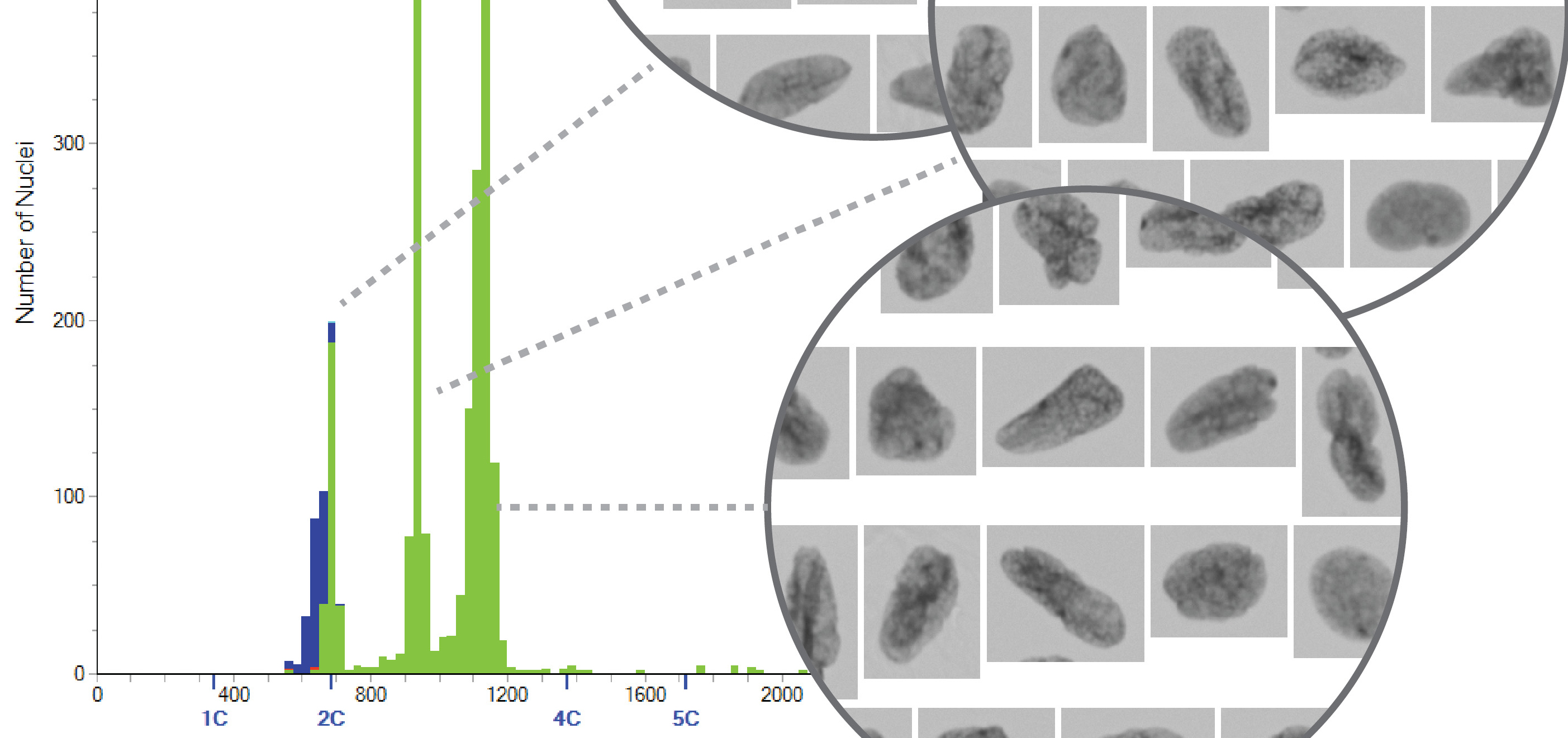 I hovedvekten av nyere publiserte arbeider om kromosomale endringer ved kreft presenteres analyser utført på gennivå. Nyere studier viser imidlertid stor grad av intratumorheterogenitet (4), noe som gjør identifikasjon av universelle biomarkører utfordrende. Det er vist at DNA-ploiditet er en av de minst heterogene biomarkørene (4). DNA-ploidianalyser benyttes for å detektere større genomiske endringer (mer enn 5 % av total DNA-mengde) i en cellepopulasjon, og det er vist at metoden gir prognostisk informasjon for en rekke krefttyper (5–8).