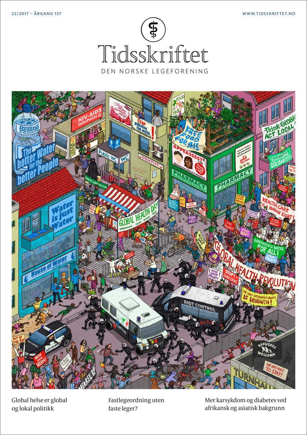 Forside Forside () sporsmal_grey_rgb Artikkel Illustrasjon © Markus Wende – www.animationsfilm.de I 2015 vedtok FN 17 mål for bærekraftig utvikling frem mot 2030. Ett mål er spesifikt rettet mot helsearbeid, nemlig «å sikre god helse og fremme livskvalitet for alle, uansett alder». De resterende målene viser likevel hvor nært knyttet helse er til andre store globale utfordringer som migrasjon, klimaendringer, likestilling, tilgang til rent vann, rettferdig fordeling, byutvikling og utvikling av infrastruktur – for alle. Det er nesten så man kan bli fristet til å si at alt henger sammen med alt. Men først og fremst handler det om politikk – også her hjemme. Kommentarer ( 0 ) Dette kommentarfeltet modereres, men kommentarer blir ikke redaksjonelt behandlet ut over å sikre at de følger retningslinjer for vårt kommentarfelt. Denne artikkelen ble publisert for mer enn 12 måneder siden, og vi har derfor stengt for nye kommentarer. Publisert: 28. november 2017 Utgave 22, 28. november 2017 Tidsskr Nor Legeforen 28. november 2017 Vol. 137. doi: 10.4045/tidsskr.17.22.02 PlumX Publisert: 28. november 2017 Utgave 22, 28. november 2017 Tidsskr Nor Legeforen 2017 Vol. 137. doi: 10.4045/tidsskr.17.22.02 Plum Print visual indicator of research metrics PlumX Metrics PDF Får du ikke vist PDF-filen eller vil lagre filen, kan du høyreklikke på PDF-ikonet. Velg «Lagre mål/fil som..» og hent så opp PDF-filen i for eksempel Acrobat Reader. Skriv ut Anbefalte artikler