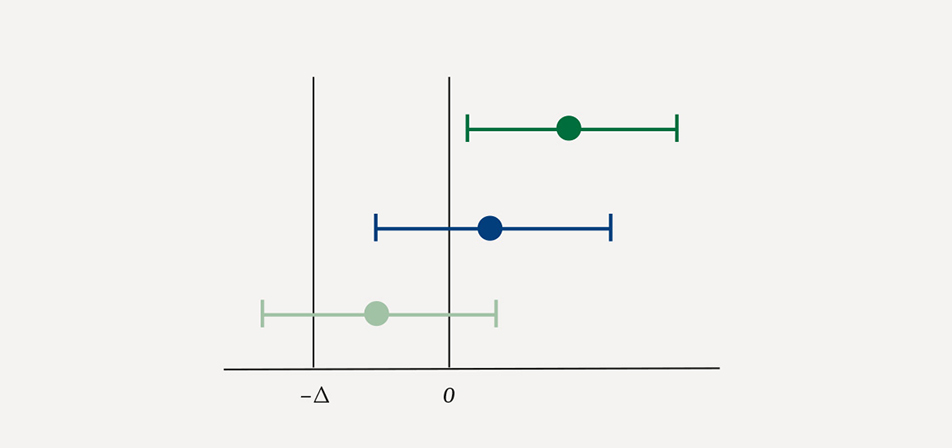 Når man ønsker å vise at to behandlinger eller behandlingsstrategier har tilnærmet like god effekt, «snur» man i stedet testsituasjonen. Da skal nullhypotesen være at den eksperimentelle behandlingen er dårligere enn standardbehandlingen, mens forskningshypotesen, som ofte kalles alternativ hypotese, er at den eksperimentelle behandlingen er like god som, eller bedre enn standardbehandlingen. I praksis gjør man altså en ensidig test. På engelsk kalles slike studier «non-inferiority studies», og det er tatt til orde for å kalle dem «ikke-underlegenhetsstudier» på norsk (3). I mer tradisjonelle studier der man ønsker å vise effektforskjell, er tommelfingerregelen for øvrig å gjøre en tosidig test.