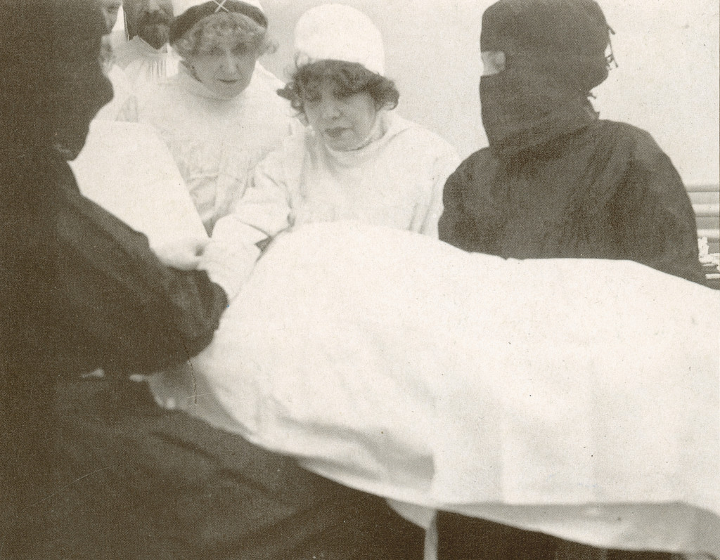 Når bildet er tatt? Det er udatert, men la oss gjette på ca. 1913. Sarah Bernhardt hadde nemlig skadet sitt høyre kne i 1905 under en Tosca-forestilling. Denne kneskaden førte til at hun måtte amputere benet i 1915 på grunn av gangren. Hun fortsatte likevel ufortrødent sin karriere, men mest i roller som kunne spilles sittende. På bildet ser vi henne stående. Med sine langvarige plager bak seg og kanskje allerede utsikter til å måtte gjennomgå en operasjon, var det kanskje ikke så rart at hun ønsket å se en operasjon?