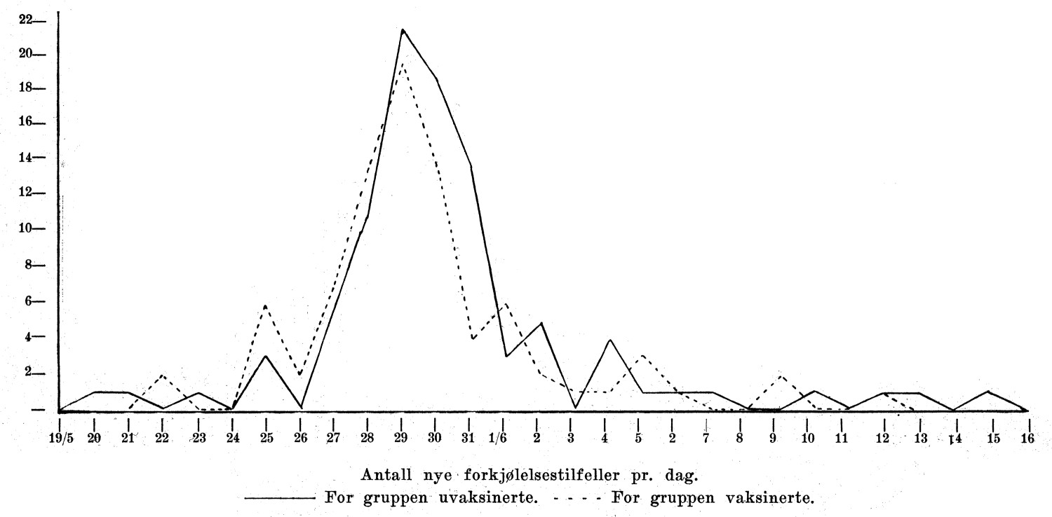 For å undersøke om vaksinasjonen skulde ha nogen innflydelse på tiden for forkjølelsens utbrudd, søkte jeg ved alle nye tilfeller med en gang å få fastslått begynnelsesdagen. Som man ser av den vedføide kurve, er der ingen merkbar forskjell mellem de to grupper. (…)