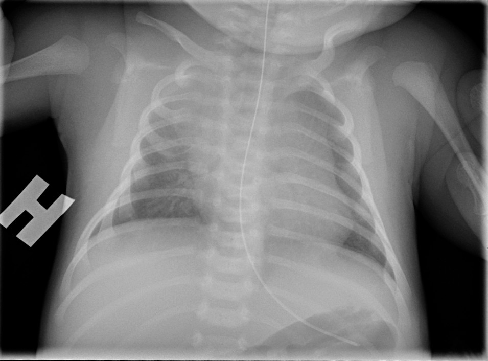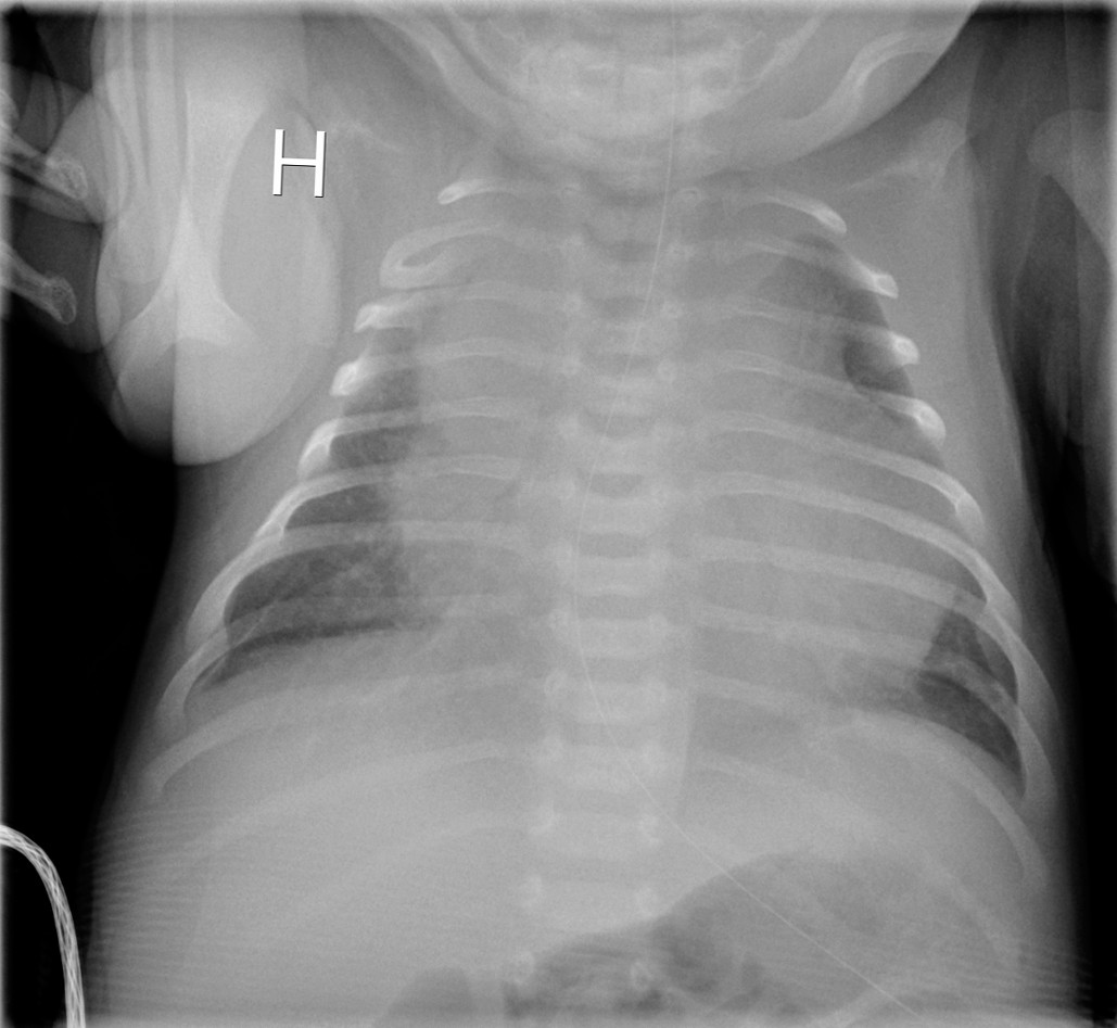 En 14-dager gammel lett prematur gutt ble innlagt grunnet redusert matinntak og mindre spontanbevegelse av høyre arm. Klinisk undersøkelse ga upåfallende funn, bortsett fra asymmetrisk spontanbevegelse av armene. C-reaktivt protein (CRP) var 29 mg/l (< 5 mg/l), og det var normale b-leukocytter. Røntgen thorax var upåfallende (bilde 1). Dagen etter innleggelsen ga MR mistanke om bløtvevsinfeksjon langs høyre thoraxvegg, og man startet med ampicillin og gentamycin intravenøst. Barnet hadde ikke feber. Senere på dagen steg CRP til 60 mg/l, og ultralyd av brystveggen viste høyresidig subkutan inflammasjon. Det var ingen synlige inflammasjonstegn i overliggende hud, men gutten var uttalt irritabel og smertepåvirket. Klindamycin ble da lagt til opprinnelig antibiotikaregime for å dekke for nekrotiserende fasciitt.