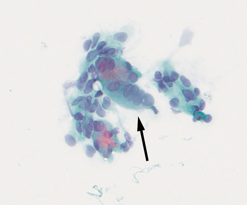 Ultralyd av halsen viste en venstresidig tumor på 1,6 × 3,2 cm, velavgrenset og lavekkoisk. Finnålsaspirasjonscytologi viste spolformede celler med ovale kjerner med et finfordelt nukleokromatin og med en cytoplasmaende på én eller begge sider av kjernen. På histologibildet ser vi multinukleære celler med et rikelig, lyst cytoplasma som kan representere multinukleære muskelceller (svart pil).