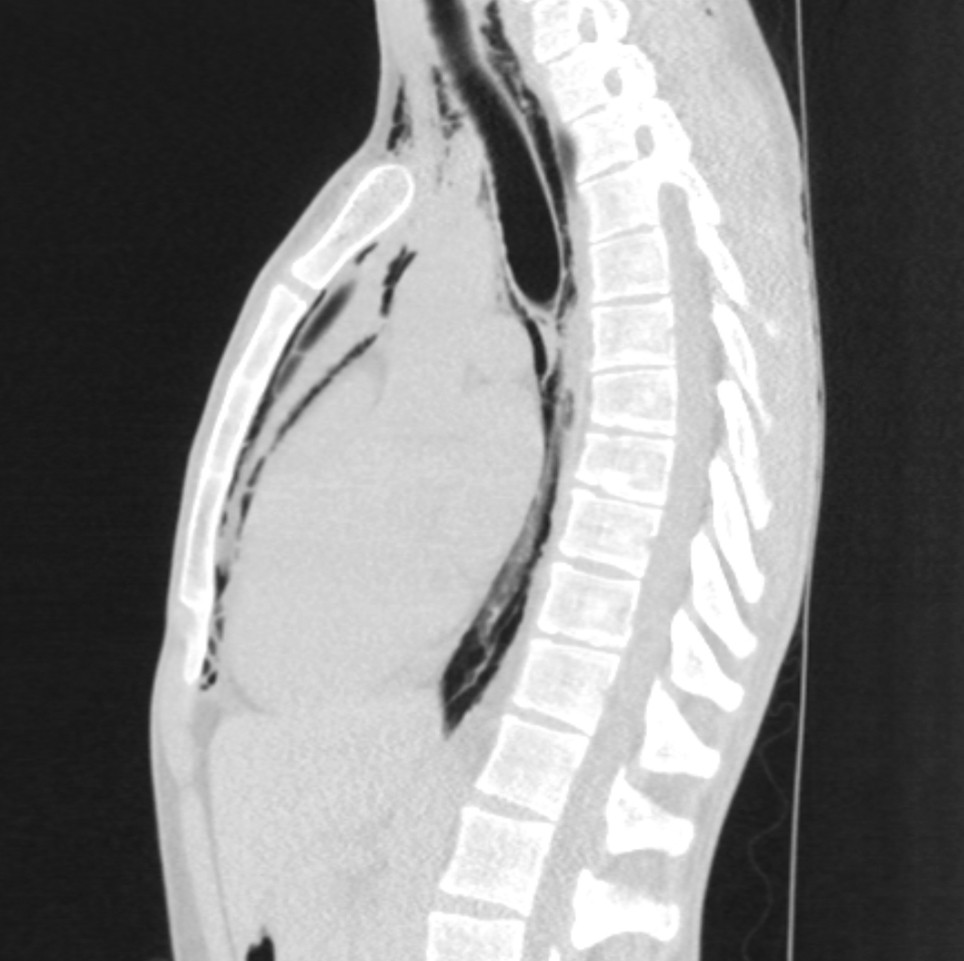 Røntgen thorax viste luft i bløtvevet på halsen og supraklavikulært bilateralt, langs trachea, hjertet og langs aortakonturen lateralt. CT thorax uten intravenøs kontrast bekreftet pneumomediastinum og utelukket pneumothorax. Ved kontroll etter tre uker var pasienten smertefri, og røntgen thorax viste fullstendig regress av pneumomediastinum.