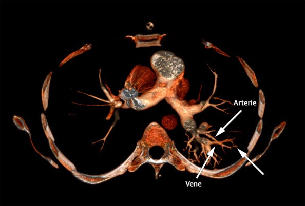 Det 3D-rekonstruerte CT-bildet viser her komplekse pulmonale arteriovenøse malformasjoner – en unormal kommunikasjon mellom pulmonalarterier og pulmonalvener – hos en mann i 30-årene som ble innlagt grunnet akutt dyspné.