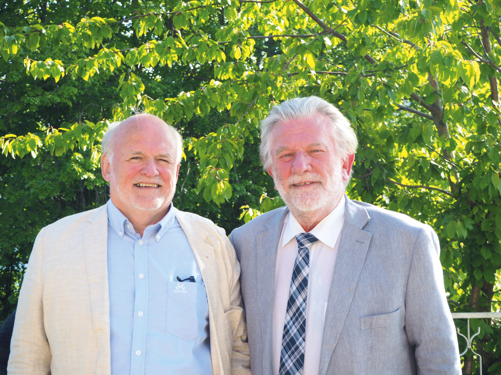ENGASJEMENT OG BEGEISTRING: Tidligere utenrikskorrespondent i NRK Hans-Wilhelm Steinfeld (t.h) og leder Gunnar Ramstad skapte entusiasme på årsmøtet i Hordaland legeforening. Foto: T. S. Strand