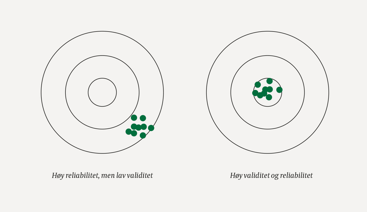 Hvis vi gjentar en måling ved like betingelser, er det betryggende å få like resultater. Målingen viser høy repeterbarhet eller reproduserbarhet, noe vi uttrykker som reliabilitet (1) . God reliabilitet er likevel til liten hjelp hvis målingen er systematisk feil eller måler noe annet enn det vi ønsker. En vekt kan gi identiske resultater ved gjentatte målinger, men hvis den alltid viser for lav verdi, er det likevel en dårlig måling. Tilsvarende er et spørreskjema med reproduserbare resultater lite nyttig hvis spørsmålene ikke er relevante for det vi ønsker å måle (fig 1).