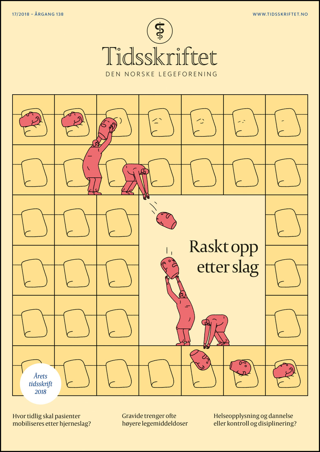 Audun Gjerdi er en Oslo-basert illustratør og har laget forsiden til denne utgaven av Tidsskriftet. Han var slått av hvordan pasientene nå «hopper over» hviledagene og blir dratt ut av sengen: «Skulle jeg ikke få hvile litt nå?»