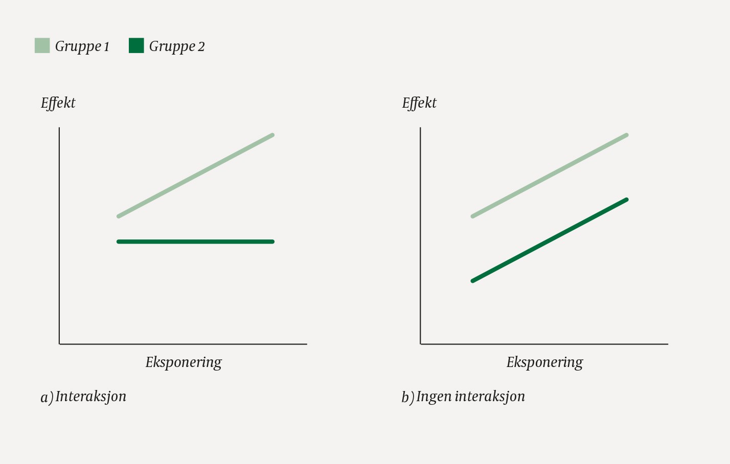 I eksemplet over har vi primært vært interessert i effekten av én gitt eksponering (røyking) og vi har studert hvordan denne effekten har variert i forhold til nivå av en annen variabel (kjønn). Dette kalles også ofte for effektmodifisering. Dette er prinsipielt forskjellig fra situasjonen hvor vi har to eksponeringer og er interessert i effekten av å kombinere disse eksponeringene. Et klinisk eksempel på dette kan være at vi er interessert i den kombinerte effekten av to blodfortynnende medikamenter på risiko for hjertesykdom og vår primær interesse er om den kombinerte effekten er større enn summen av de to individuelle effektene. Den prinsipielle forskjellen består altså i at mens vi i eksemplet over primært var interessert i effekten av én gitt eksponering, er vi nå interessert i den kombinerte effekten av to eksponeringer. Fra et statistisk ståsted er det imidlertid ingen stor forskjell på disse to problemstillingene. Vi kan undersøke begge ved å inkludere et interaksjonsledd i en regresjonsmodell.