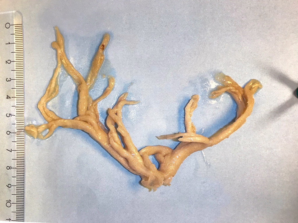 En kvinne i slutten av 30-årene ble innlagt ved sykehus grunnet hoste og dyspné. Hun hadde i forkant vært utredet hos fastlegen, som mistenkte asthma bronchiale. Ved innleggelse ble hennes tilstand oppfattet som infeksjonsutløst astmaforverring, og det ble startet med antibiotika og antiobstruktiv behandling. Hun utviklet etter kort tid alvorlig respirasjonssvikt, ble intubert og overflyttet intensivavdelingen på et universitetssykehus. Det var vanskelig å gi henne adekvat ventilasjon med respirator, så det ble anlagt venovenøs ekstrakorporal membranoksygenering (ECMO). Under pågående ECMO-behandling viste bronkoskopi et gummiaktig materiale i trachea. Dette forgrente seg distalt til begge lungers bronkialtre, med obstruksjon av store deler av lumen. Materialet ble fjernet under bronkoskopien, fra venstre lunge i nærmest ett stykke. Man fant en gummiaktig avstøpning av bronkialtreet med en fastere konsistens enn ordinære slimplugger (bilde 1).