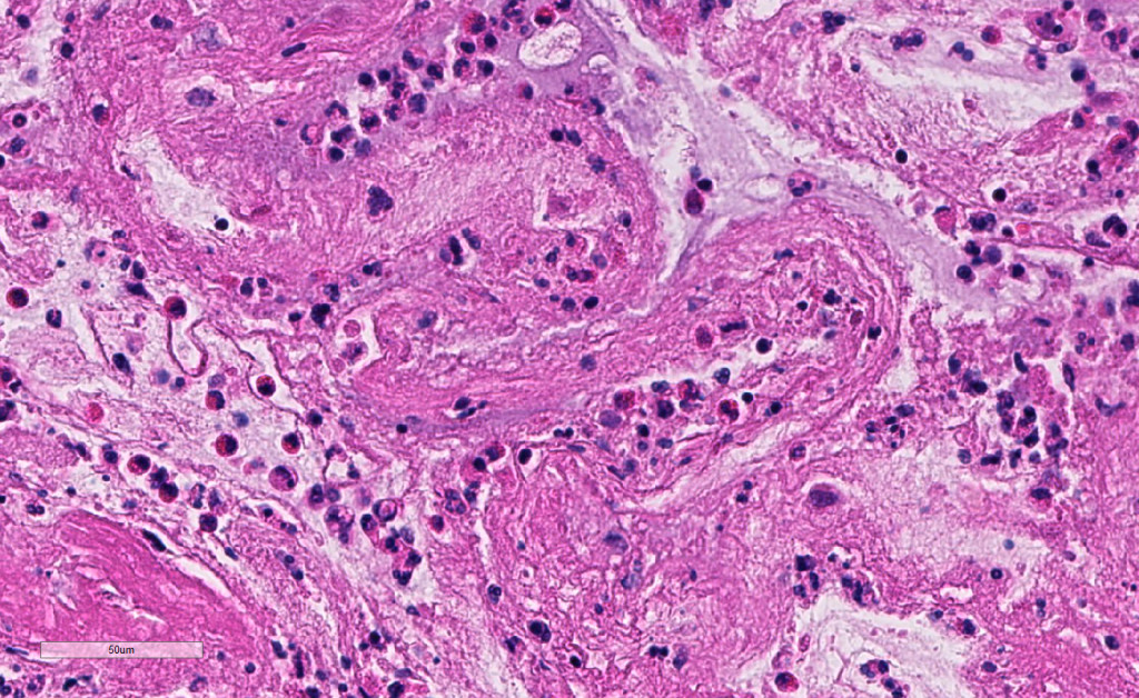 Mikroskopisk undersøkelse viste et fibrinøst materiale med rikelig eosinofile granulocytter, men også nøytrofile granulocytter, lymfocytter og plasmaceller (bilde 2, på nett). Plastisk bronkitt med eosinofil avstøpning er assosiert med astma/atopi eller infeksjon med Aspergillus (allergisk bronkopulmonal aspergillose/Aspergillus trakeobronkitt) (2) . Vår pasient fikk i tillegg til behandling for antatt astma også bred antimikrobiell behandling, inkludert soppdekning. Det ble imidlertid aldri påvist noen mikrobe, ei heller annen utløsende årsak til plastisk bronkitt. Pasientens tilstand bedret seg etter fjerning av avstøpningen. ECMO-behandlingen kunne avvikles, og hun ble avvent fra respirator. Ved senere kontroller har hun ikke hatt luftveissymptomer og bruker ingen inhalasjonsmedisiner. Lungefunksjonstester viser nå normale funn og bronkoskopi er uten tegn til residiv. Årsaken til plastisk bronkitt med eosinofil avstøpning hos denne pasienten er fortsatt ikke avklart.