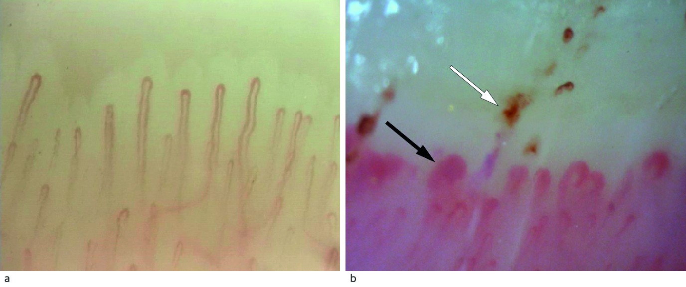En måned senere ble pasienten undersøkt av revmatolog, som fant noe stramhet i hud distalt for metakarpofalangealledd, ellers normal hud. Kapillaroskopi av neglesenger viste patologi, med flere megakapillarer og enkelte mikroblødninger (figur 2). Det var ikke tegn til perifer artritt eller muskelsvakhet. Orienterende blodprøver viste økt kreatinkinase (CK) 1 259 U/l (35–210) og normale stoffskifteprøver. Urinstiks og -mikroskopi var upåfallende.