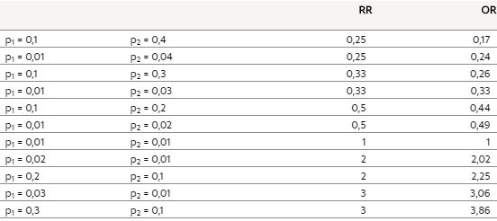 Illustrasjon av forskjell mellom relativ risiko (RR) og oddsforholdet (OR) for forskjellige verdier av sannsynligheten for sykdom blant de eksponerte (p1) og de ikke-eksponerte (p2).