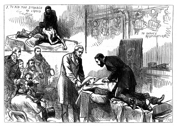 Demonstrasjon av gjenopplivingsmetoden brukt av dr. Howard fra New York. Illustrasjon: Wellcome Collection, lisensiert under CC BY.