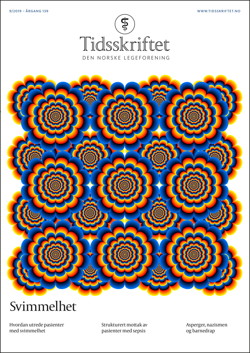 Forside Forside nr. 9/2019 () sporsmal_grey_rgb Artikkel Illustrasjon © Akiyoshi Kitaoka 2014 / Kanzen Advarsel: Blue expansies er en optisk illusjon som kan gjøre tilskueren svimmel og uvel. Den er laget av Akiyoshi Kitaoka, professor i psykologi ved Ritsumeikan University i Kyoto. Gjennom forskning på optiske illusjoner forsøker han å gi svar på hvordan hjernens system for visuell persepsjon fungerer. Flere av hans verker kan du se på tinyurl.com/akitaoka Kommentarer ( 0 ) Dette kommentarfeltet modereres, men kommentarer blir ikke redaksjonelt behandlet ut over å sikre at de følger retningslinjer for vårt kommentarfelt. Denne artikkelen ble publisert for mer enn 12 måneder siden, og vi har derfor stengt for nye kommentarer. Publisert: 27. mai 2019 Utgave 9, 28. mai 2019 Tidsskr Nor Legeforen 27. mai 2019 Vol. 139. doi: 10.4045/tidsskr.19.09.02 PlumX Publisert: 27. mai 2019 Utgave 9, 28. mai 2019 Tidsskr Nor Legeforen 2019 Vol. 139. doi: 10.4045/tidsskr.19.09.02 Plum Print visual indicator of research metrics PlumX Metrics PDF Får du ikke vist PDF-filen eller vil lagre filen, kan du høyreklikke på PDF-ikonet. Velg «Lagre mål/fil som..» og hent så opp PDF-filen i for eksempel Acrobat Reader. Skriv ut Anbefalte artikler