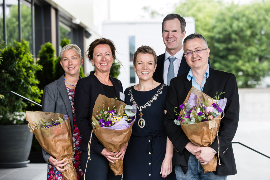 ÅRETS VINNERE: Prisvinnerne sammen med president Marit Hermansen og visepresident Christer Mjåset. Fra venstre: Hilde Engjom, Mette Lyberg Rasmussen, Marit Hermansen, Christer Mjåset, Nezar Raouf. Foto: Thomas Eckhoff.