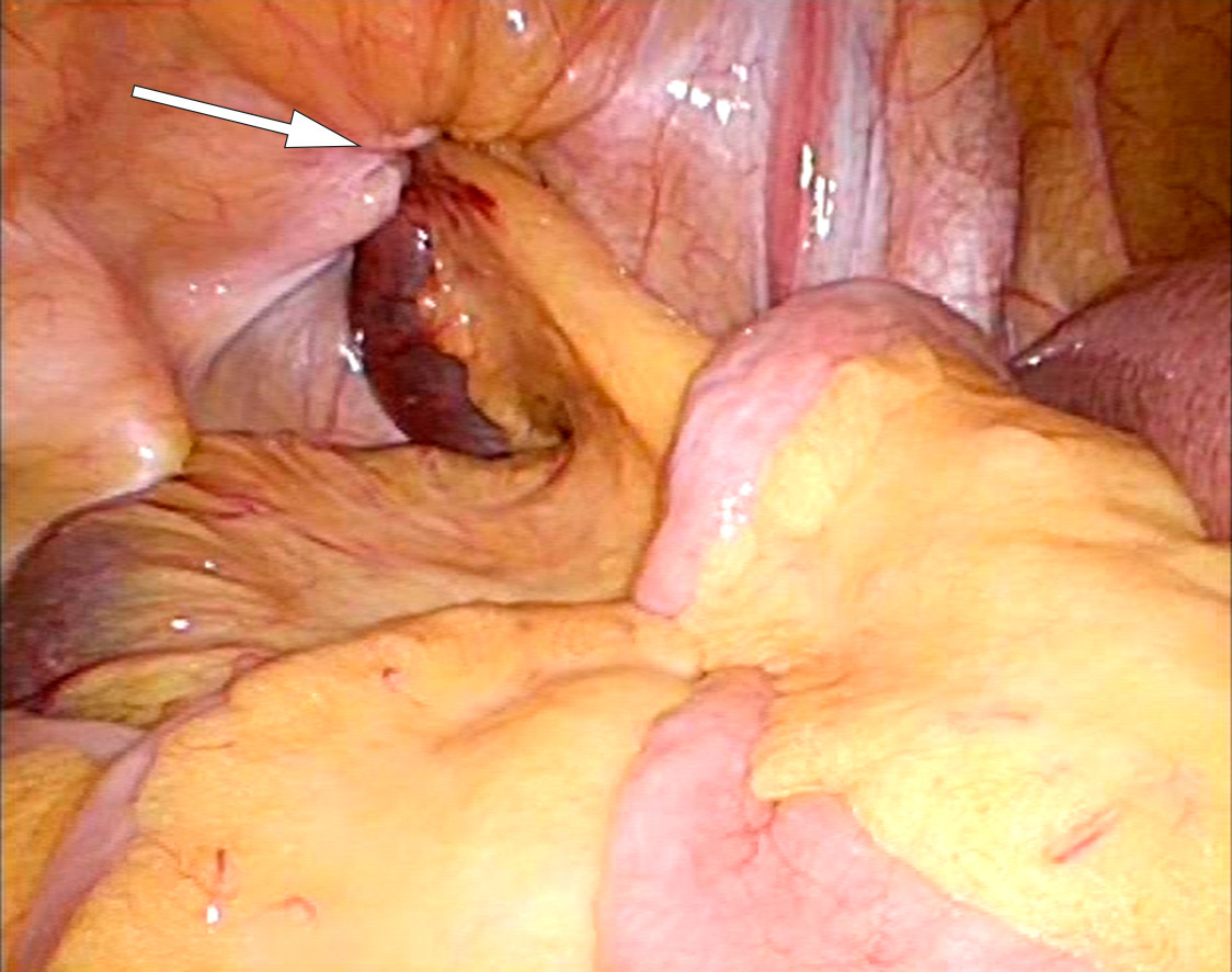 På bildet sees et inkarserert obturatorhernie under laparoskopi. Obturatorhernier er sjeldne og representerer mellom 0,07 og 1 % av alle bukhernier (1, 2) . Som regel er det tynntarmen som hernierer gjennom den 2–3 cm lange og 1 cm brede obturatorkanalen i bekkenet. Brokket opptrer oftest hos eldre kvinner, og fordi åpningen på venstre side er beskyttet av sigmoideum, er det vanligst på høyre side. Selv om tilstanden er sjelden, har inkarserert obturatorhernie den høyeste dødeligheten (13–70 % dødelighet i ulike studier) av alle bukveggshernier (1, 2) . Symptomene er ofte uspesifikke med magesmerter i nedre høyre del av buken, som en sjelden gang kan palperes som en oppfylning medialt på låret. CT er et viktig supplement i utredningen, og funn av tynntarm mellom musculus pectineus og musculus obturatorius er diagnostisk. Behandlingen er kirurgisk, og både åpen og laparoskopisk tilgang er beskrevet. Laparoskopisk kirurgi gir mindre postoperative smerter, færre postoperative komplikasjoner og kortere sykehusopphold (1) .