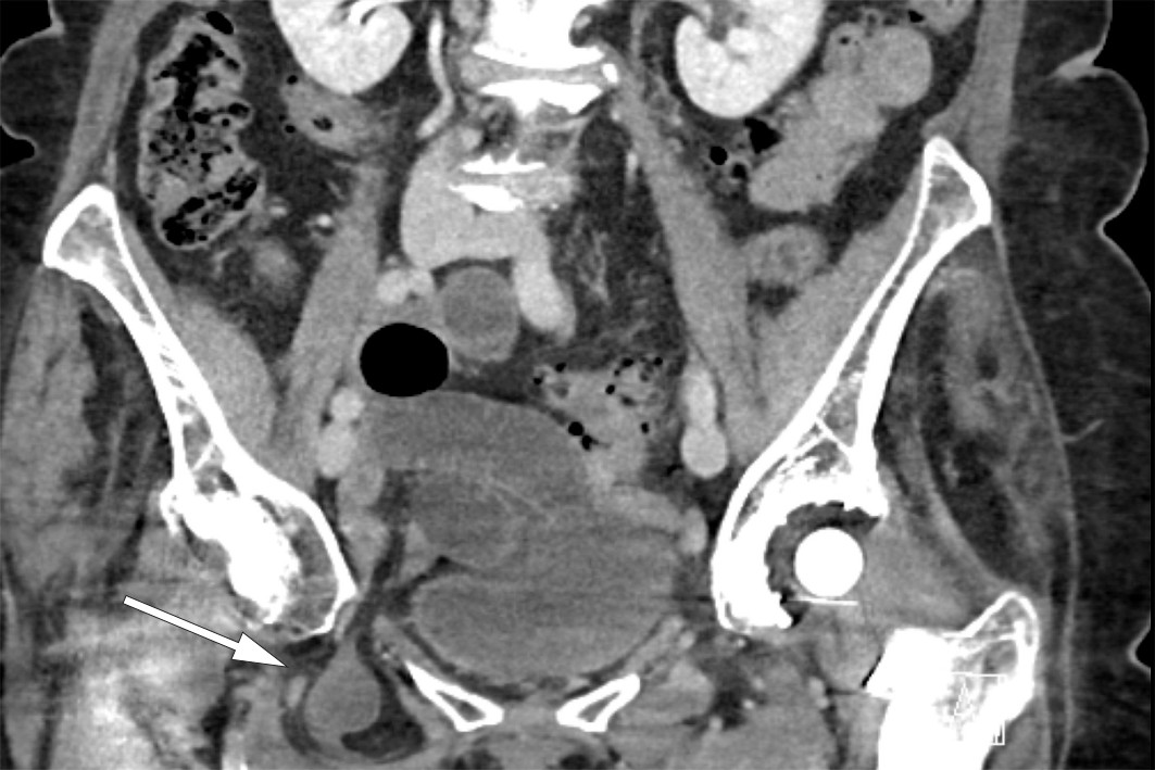 En sprek kvinne i 80-årene kom inn til sykehus med få timers sykehistorie med akutt innsettende og sterke magesmerter i nedre høyre del av buken. Ved undersøkelse var hun palpasjonsøm i samme område. Hun var tydelig smertepåvirket, men vitale tegn var normale. Blodprøver var alle innenfor referanseområdet. CT abdomen viste et høyresidig obturatorhernie med inkarserert tynntarm og begynnende preobstruktiv tarmdilatasjon (se CT-bilde). Pasienten ble først laparoskopert, og det inkarsererte tynntarmssegmentet og brokksekk ble reponert inn i bukhulen. Tarmen var viabel. Funnet var typisk for inkarserert tynntarm i et obturatorhernie. Det ble deretter lagt inn et preperitonealt nett ved hjelp av total ekstraperitoneal plastikk (TEP). Pasienten ble sendt hjem i velbefinnende første postoperative dag.