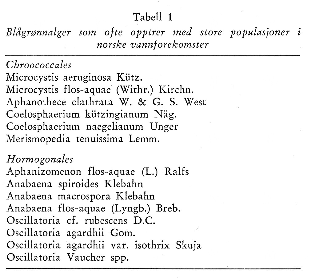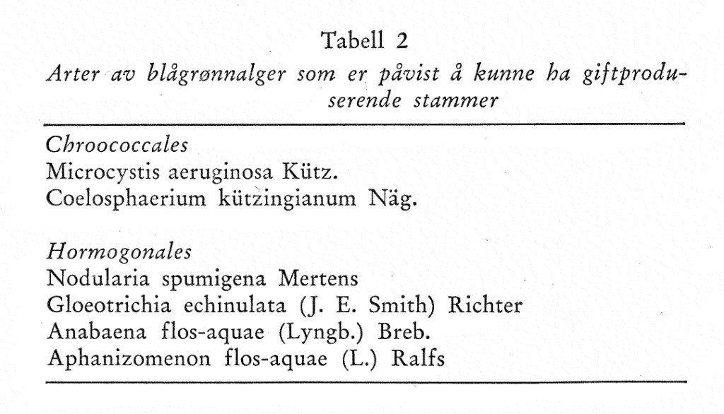 I flere norske innsjøer har det etter hvert blitt stor produksjon av blågrønnalger som under gitte betingelser kan medføre forgiftninger. Slike vannforekomster blir i voksende omfang tatt i bruk til vannforsyning for mennesker og dyr, og det vil derfor være riktig å ha noe oppmerksomhet rettet mot disse forhold.